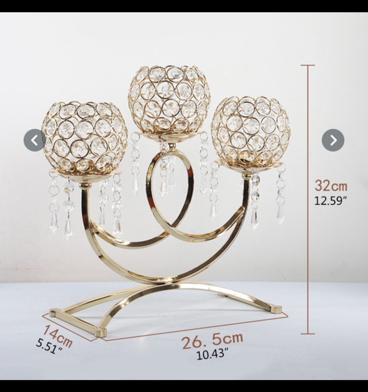 3-arm crystal candle stick holder is an elegant and timeless piece that can add sophistication to any setting. These candle holders typically feature crystal or glass arms with intricate designs, and they often have a polished or faceted finish that reflects light beautifully.